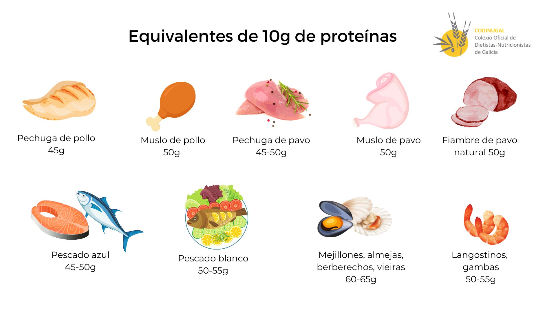Entender as cantidades de hidratos de carbono, proteínas ou graxas que hai nos alimentos pode ser complicado. Por iso, preparamos estas infografías visuais con equivalencias prácticas: porcións reais de alimentos que conteñen, por exemplo, 10 g de hidratos de carbono ou de proteínas.